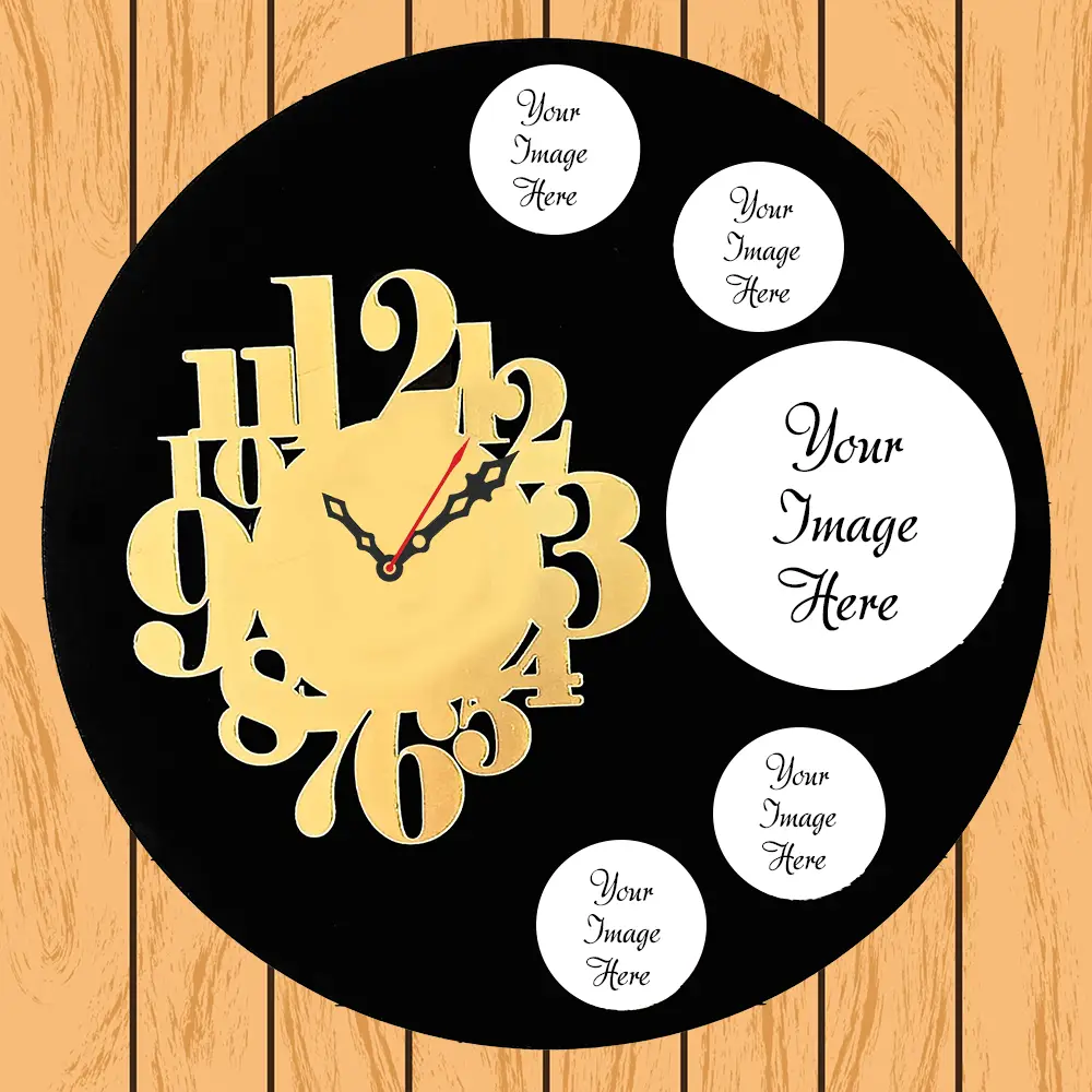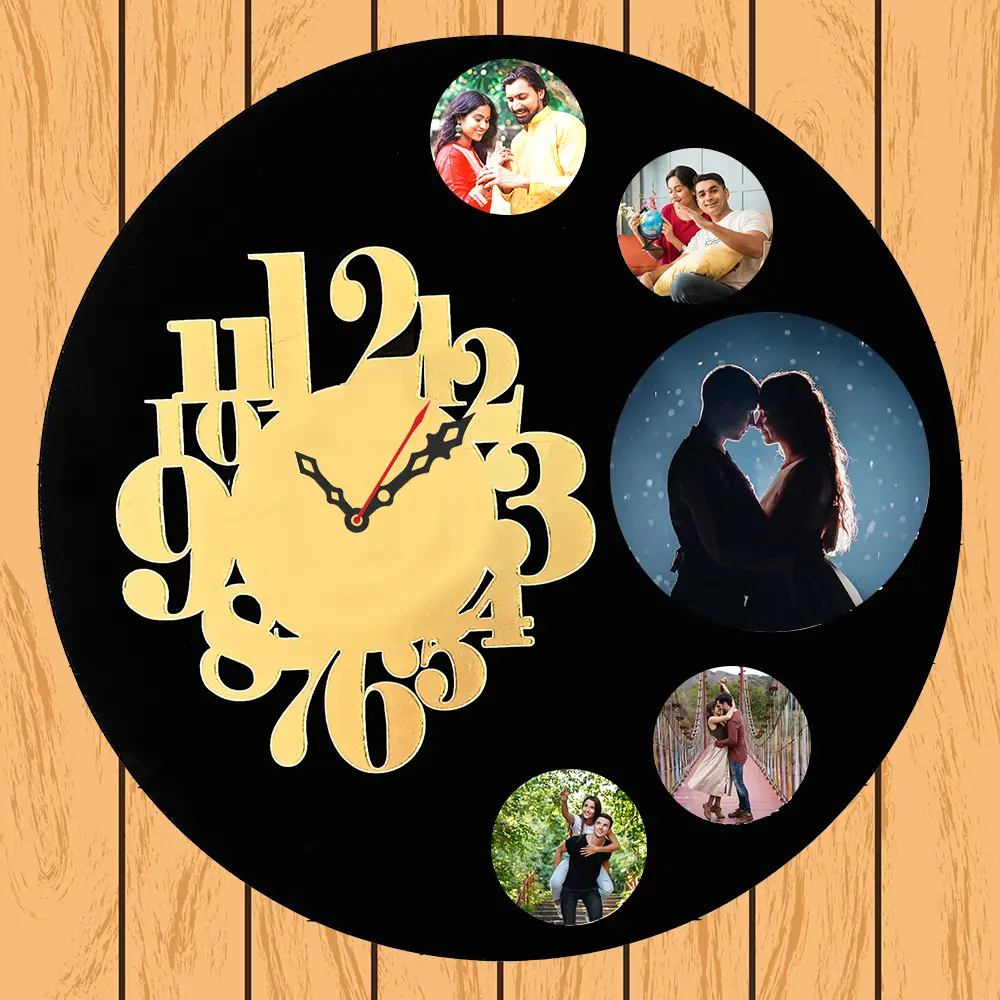 ransform your walls into a gallery of memories with the MDF Wall Clock WC-04 by IGIFTZI — a unique fusion of functionality and personalization. Crafted from premium quality MDF wood and finished with an elegant golden acrylic 1 to 12 figure dial, this wall clock is designed to capture hearts and time alike.